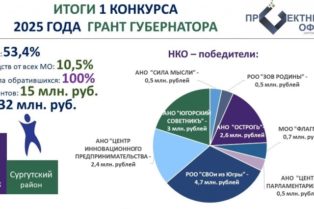 Восемь некоммерческих организаций (НКО) Сургутского района получили рекордную сумму в 14,8 млн рублей по итогам первого конкурса «Грант Губернатора для СО НКО 2025 года».